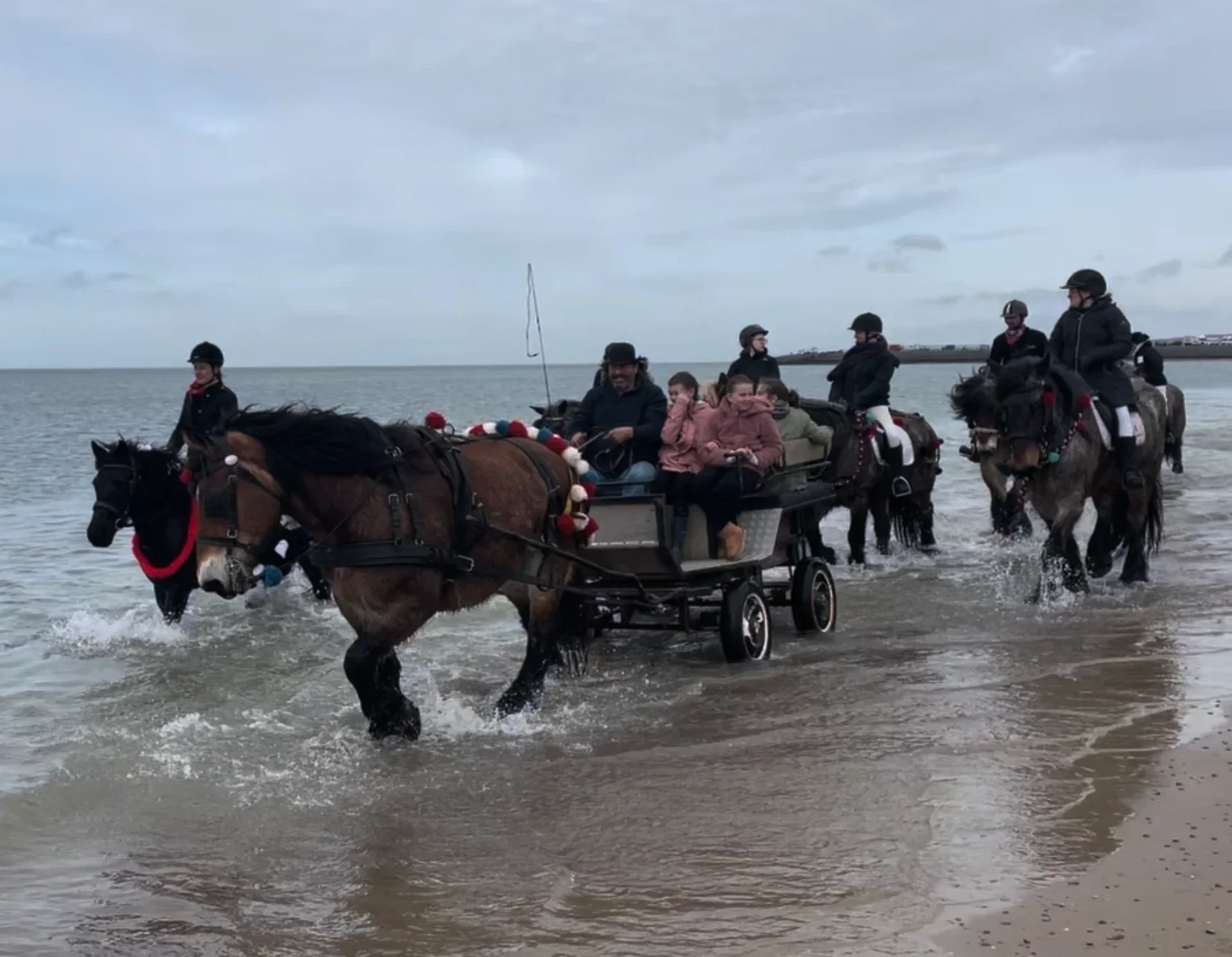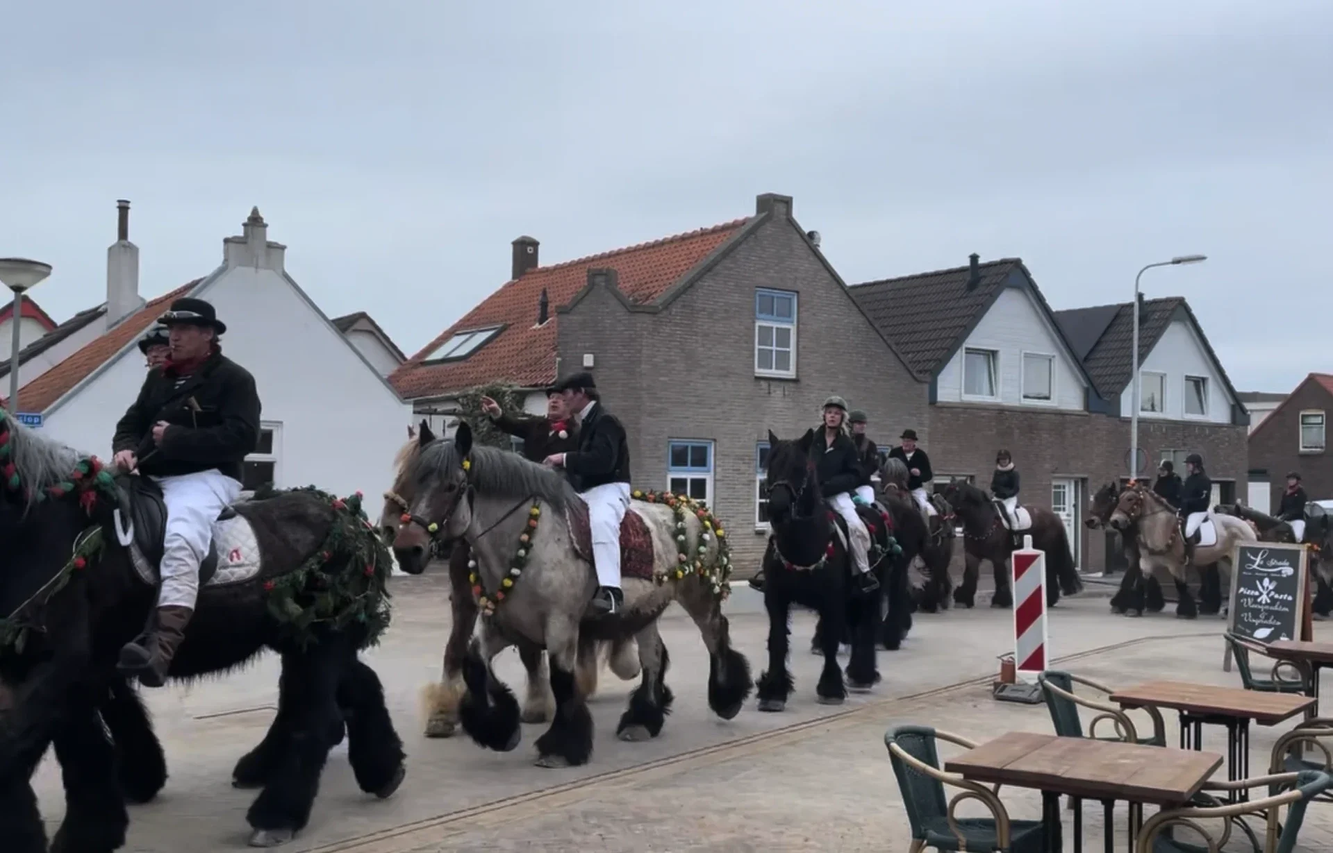 Op de ochtend van Straô verzamelen ruiters zich met hun versierde paarden in het dorp. Onder leiding van een hoornblazer trekt de stoet in optocht richting het strand.